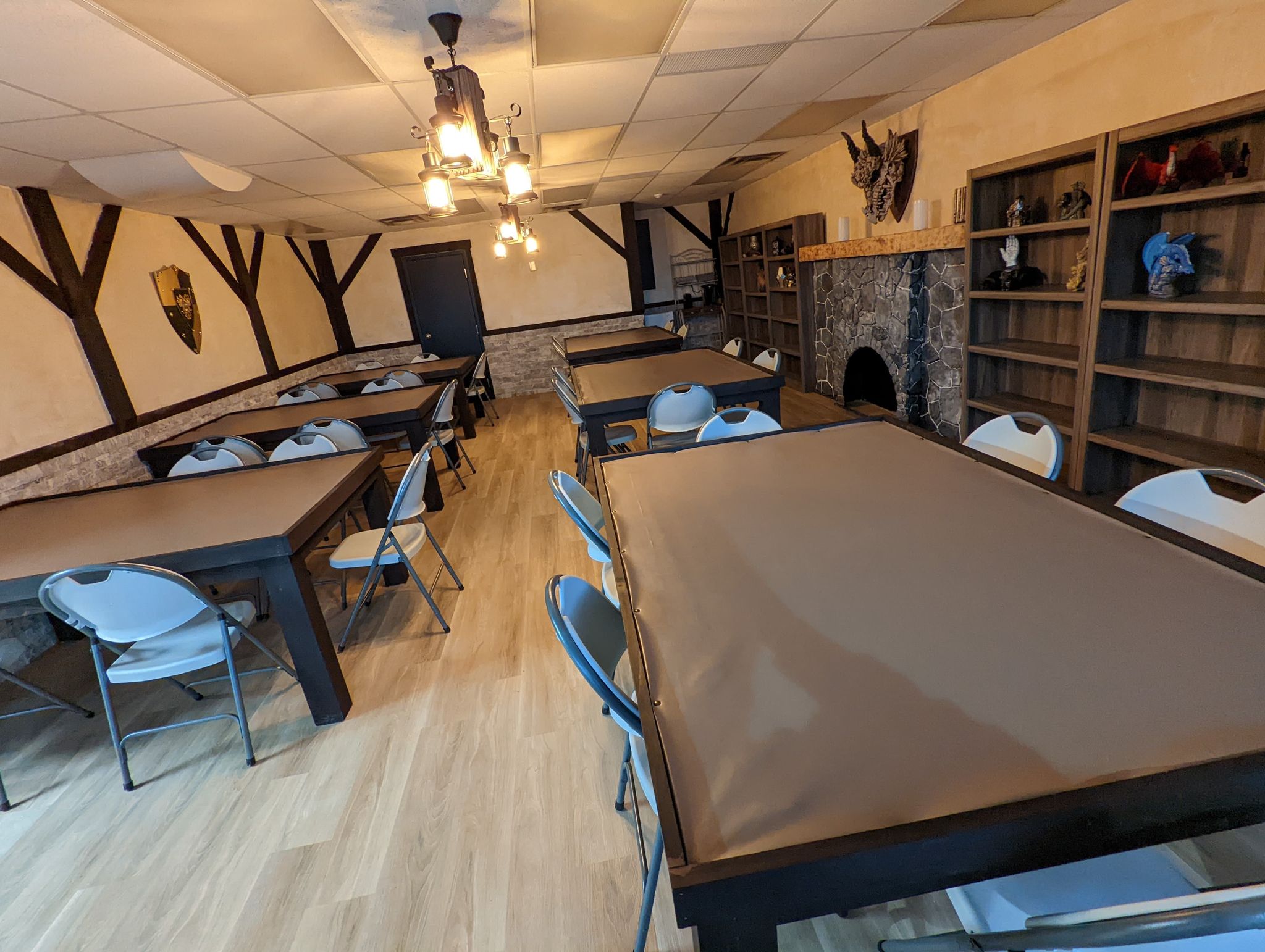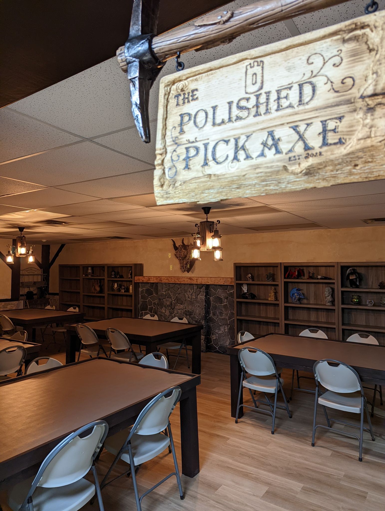 Creating and engaging with community is always a top priority at Outpost Gaming, and with this in mind we have specifically created The Polished Pickaxe. This is a custom renovated space, within Outpost Gaming, to accommodate the gaming needs of our community. The Polished Pickaxe has a medieval tavern like aesthetic that is perfect for anything from birthday parties to game tournaments. The room contains six, 4 foot by 6 foot tables that are perfect for board games, card games, and tabletop miniatures games. Each table features a dice-lip to stop those pesky math rocks from falling off the table during particularly savage attacks or enthusiastic rolls.