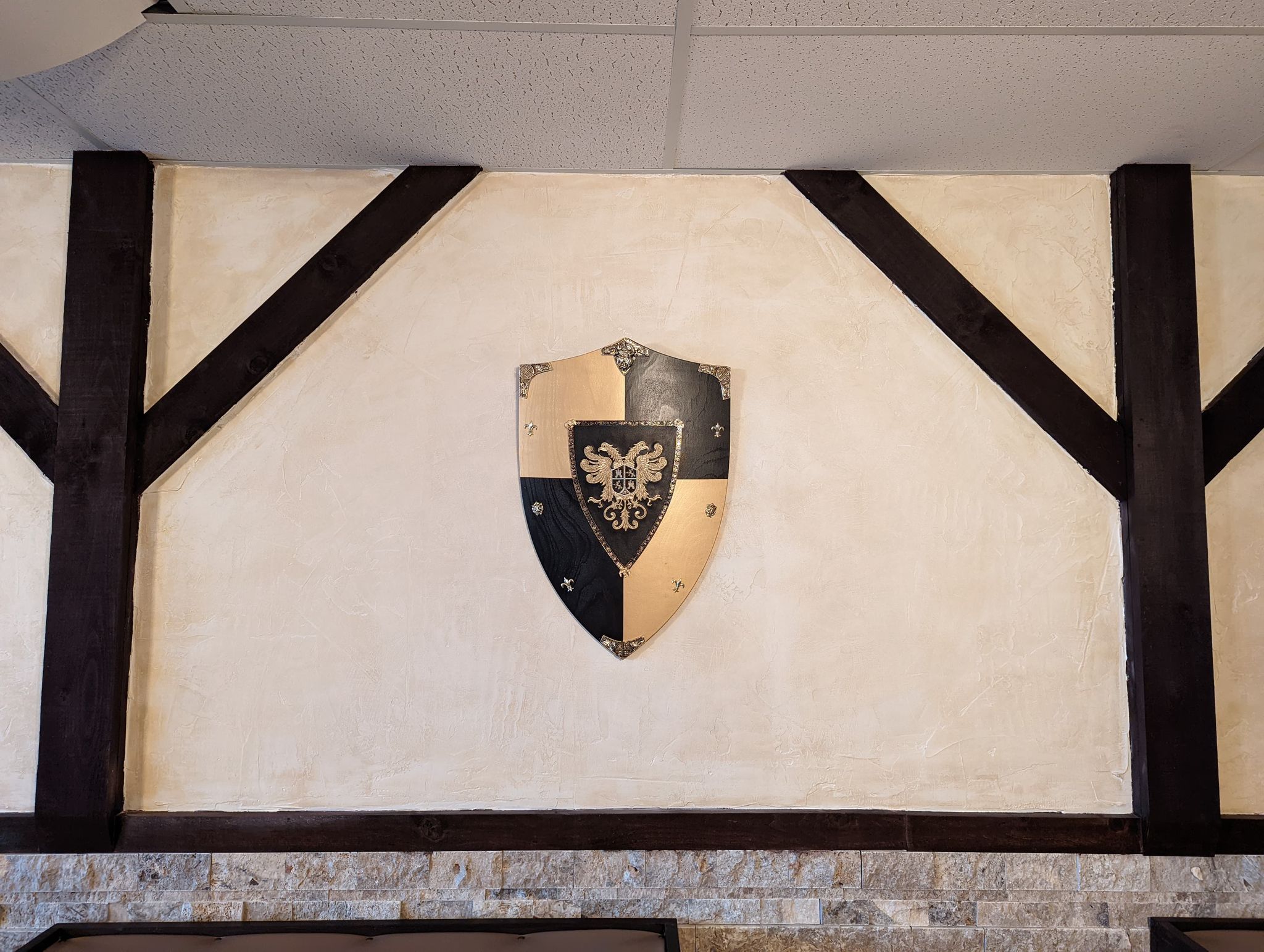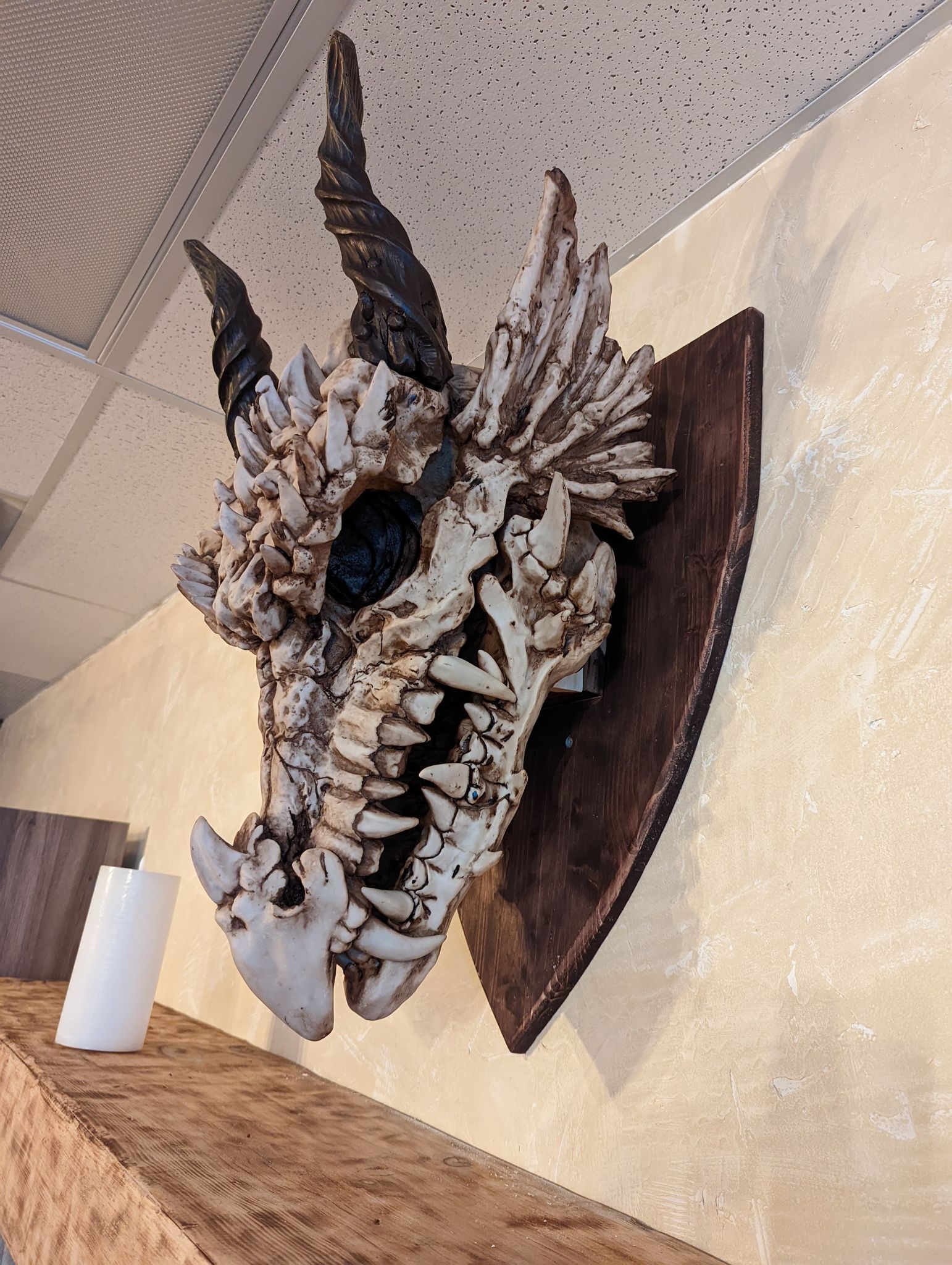 The space also features a caffeine-o-mancer station where gamers can make coffee or espresso, or just get some hot water for tea after purchasing pods/tea bags from our front desk. An accompanying ice-box also has water and soft drinks available for sale to quench your thirst after a hard-fought victory. The Polished Pickaxe has its own bathroom as well, to make for a quick break when nature calls. The entire room is surveyed by the head of the dread Korscar Diamond Eater, a particularly nasty dragon that was conquered in the development of Outpost Gaming by a couple of Knights Errant.